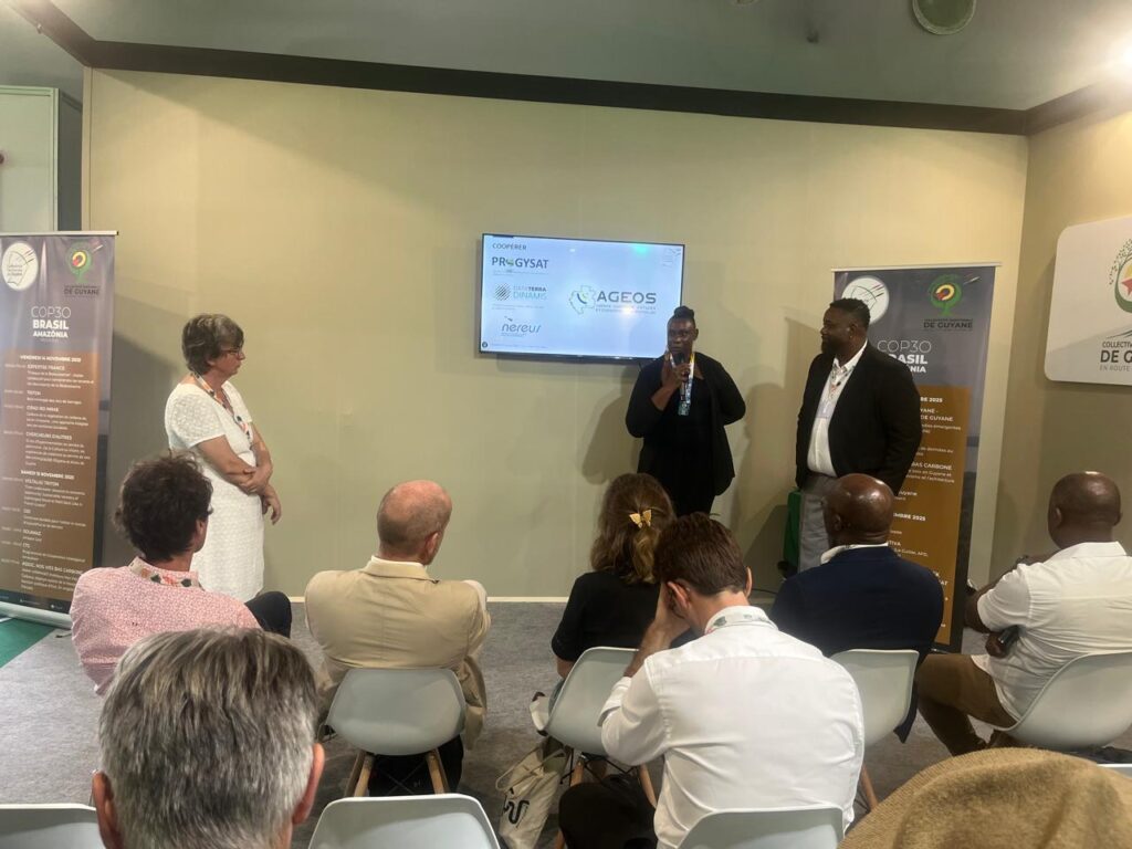 L’après-midi a mis en avant l’utilisation des données d’observation de la Terre au service de l’environnement grâce aux contributions de plusieurs institutions scientifiques. Plus tard, le Fonds mondial pour la nature (WWF) et une structure d’imagerie satellitaire ont présenté une analyse sur l’utilisation des satellites appliquée à l’estimation de l’impact aurifère transfrontalier, tandis que l’Institut national de recherche pour l’agriculture, l’alimentation et l’environnement (INRAE), l’Office International de l’Eau (OIEau) et l’Office de l’eau de Guyane ont abordé les enjeux de la gestion de l’eau et de l’adaptation climatique.