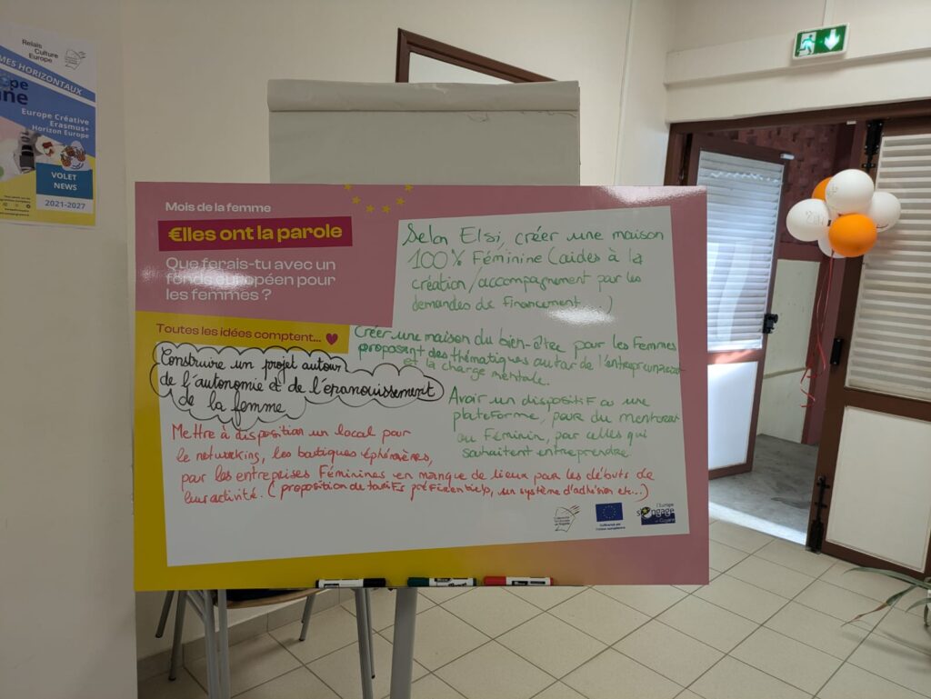 Enfin, l’évènement s’est clôturé par un moment convivial de partage, autour d’un mur d’expression. Cet espace participatif a permis aux participantes de laisser libre cours à leurs impressions, leurs attentes et leurs perceptions des fonds européens en lien avec la place des femmes. Témoignages, mots-clés et messages inspirants ont ainsi illustré la richesse des échanges et l’importance de renforcer l’accompagnement des femmes dans leurs projets.